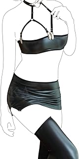 ARIKA(アリカ) ボンテージ 風 ランジェリー( ブラ + ニーハイ + スカー ) エナメル 調 レザー 調 コスプレ セクシー 過激 制服 黒 (Aセット)