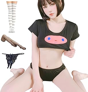 OLYOLY【5点セット】過激 セクシー コスプレ アニコス 二次元 Tシャツ オープンバスト しましま ニーハイソックス 濡れ透け 透ける 下着 穴あき Tバック (04 黒5点)